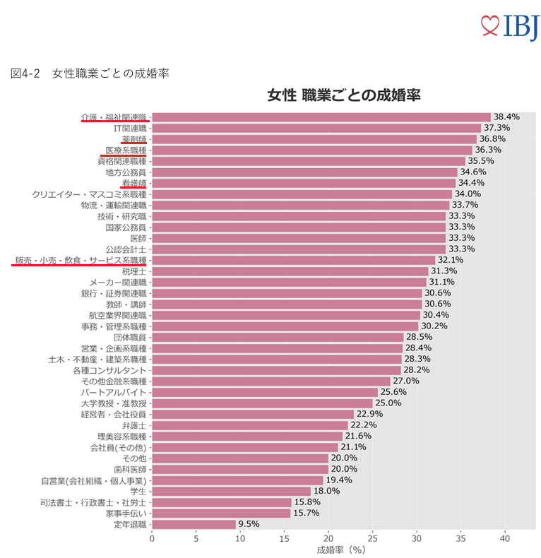 IBJの成婚データを見ると、女性の職業ごとの成婚率には次のような傾向があります。